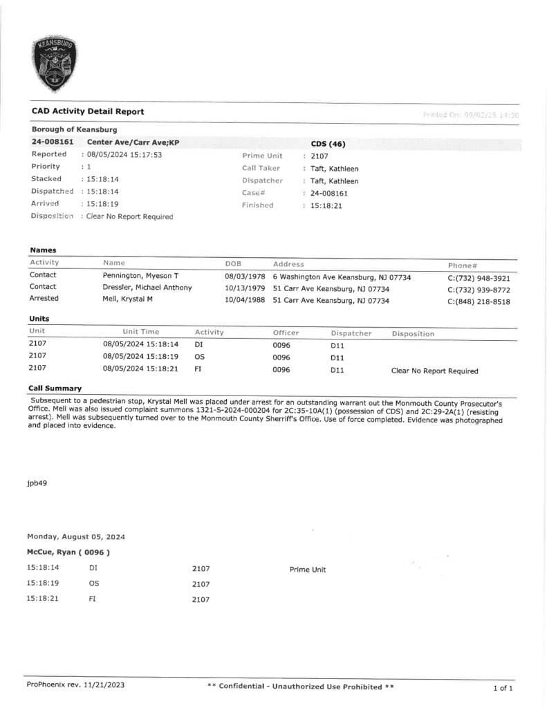 The Keansburg Police Department classified the case under CDS possession and resisting arrest, closing the incident with proper documentation.