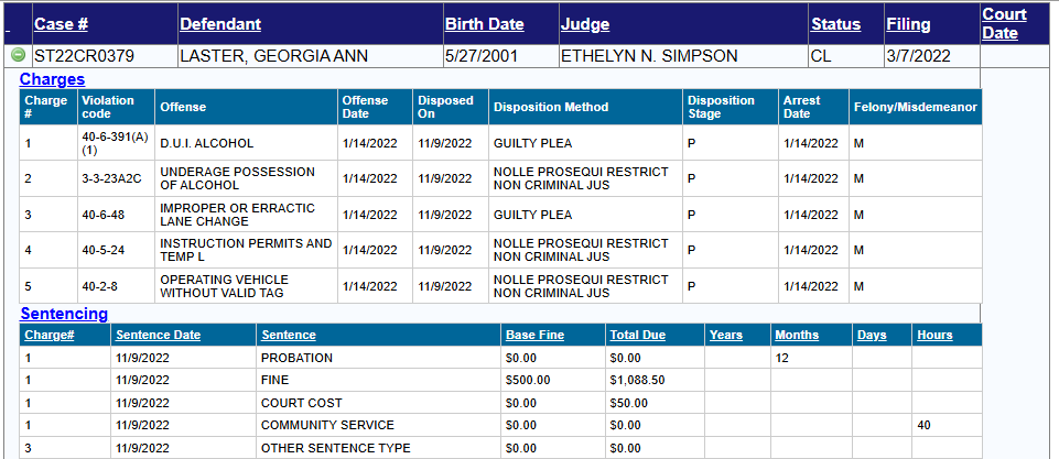 The judge sentenced Laster to 12 months of probation. She was also ordered to pay a $500 base fine and complete 40 hours of community service. Additionally, her plea agreement mandated that she attend DUI school and undergo a substance abuse evaluation and treatment.